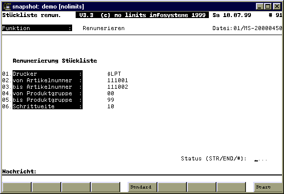 Um die durch Strukturwartungen entstehende Positionsnummern wieder in eine gleichmässige Schrittweite zu bringen, können die Strukturpositionen in einem Batchlauf renumeriert werden. Folgende Leistungsmerkmale sind realisiert: